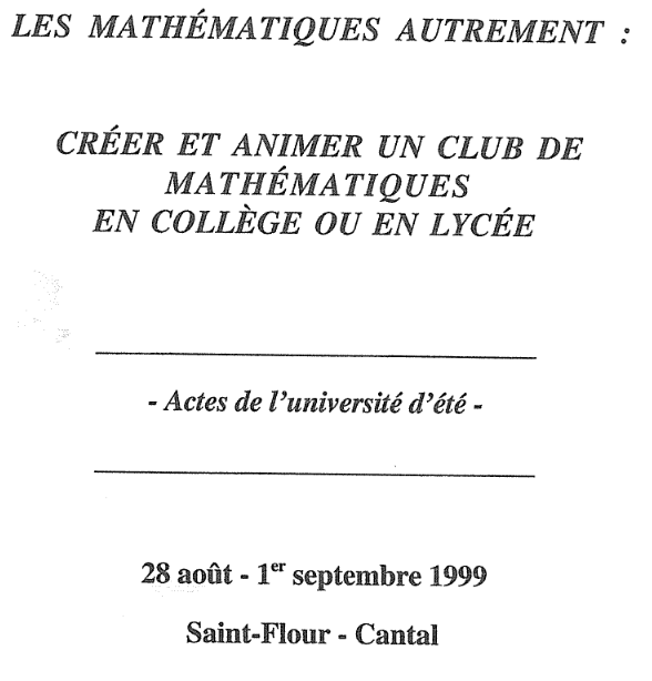 L'association ANIMATH s'est fixé comme objectif le développement des clubs et des ateliers de mathématiques dans les lycées et collèges. En complément du travail effectué en classe, ceci permettent aux élèves d'aborder les mathématiques de manière créative et de les ressentir comme source de plaisir et de passion ; l'initiation à des problématiques de recherche et à des questions actuelles est un moyen puissant pour développer la motivation et la créativité des élèves. Consciente de l'isolement des clubs existants, l'association décidait de déposer en novembre 98 un avant-projet d'Université d'Ete permettant l'échange des expériences, la mise en œuvre des réussites, la réflexion sur les contenus et la conduite des ateliers périscolaires et leur articulation avec l'enseignement, une meilleure connaissance des ressources d'Internet.